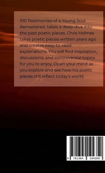 100 Testimonies of a Young Soul Remastered, takes a deep dive into the past poetic pieces. Chris Holmes takes poetic pieces written years ago and creates easy-to-read explanations. You will find inspiration, discussions, and controversial topics for you to enjoy. Open your mind as you explore and see how his poetic pieces still reflect today's world.