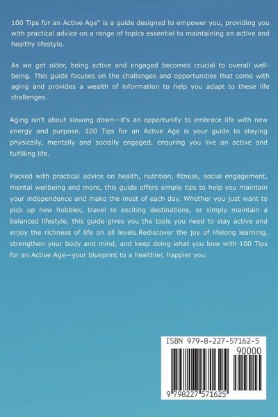 "100 Tips for an Active Age" is a comprehensive guide designed to empower readers as they age, providing practical insights and easy-to-follow advice across a wide spectrum of topics essential for maintaining a vibrant, healthy lifestyle. As we are getting older, staying active and engaged becomes crucial for overall well-being. This book recognizes the challenges and opportunities that come with age and offers a wealth of information to help readers navigate this rewarding phase of life. Starting with the importance of maintaining general health, the book opens with tips on nutrition, hydration, weight management, and regular health check-ups. These foundational health practices set the stage for readers to understand their body's changing needs and embrace habits that foster long-term vitality. Moving into physical activity, the book offers diverse and adaptable routines, from gentle stretching exercises to more invigorating activities like cycling, swimming, and strength training. Each activity is tailored to suit different fitness levels, encouraging readers to stay physically engaged in ways that feel enjoyable and achievable. Beyond physical health, "100 Tips for an Active Age" emphasizes the importance of social engagement and mental health. Readers are guided through the benefits of maintaining close connections with family and friends, engaging in community activities, and exploring hobbies that bring fulfillment. Practical advice on mindfulness, meditation, and brain-boosting activities helps readers cultivate a positive, balanced mental outlook, with suggestions for keeping the mind sharp and engaged. The book also provides insights into nutrition and diet tailored to the needs of older adults, with tips on balancing essential nutrients, choosing healthy snacks, and enjoying foods that support energy and focus. Special attention is given to practical ways of maintaining independence through home safety, mobility aids, and financial wellness tips, empowering readers to live with confidence. Chapters on preventing common health issues such as managing bone health, heart health, and vision provide readers with preventative strategies to enjoy peace of mind. For those with a love for travel, tips on planning trips, joining senior travel groups, and staying active on the go are included to enrich life's journey. In the final chapters, readers are inspired to take on new hobbies, recreational activities, and lifelong learning opportunities. From gardening and painting to online courses and local classes, these tips nurture creativity, curiosity, and personal growth. With "100 Tips for an Active Age," readers will find motivation, practical tips, and encouragement to lead a fulfilling, active life at any age. Each chapter is crafted to address a specific area of interest, empowering readers to make small, impactful changes that add up to a richer, healthier, and more enjoyable life.
