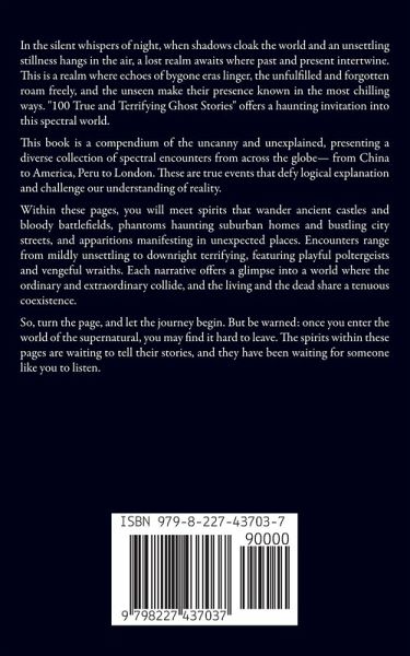 In the silent whispers of night, when shadows cloak the world and an unsettling stillness hangs in the air, a lost realm awaits where past and present intertwine. This is a realm where echoes of bygone eras linger, the unfulfilled and forgotten roam freely, and the unseen make their presence known in the most chilling ways. "100 True and Terrifying Ghost Stories" offers a haunting invitation into this spectral world. This book is a compendium of the uncanny and unexplained, presenting a diverse collection of spectral encounters from across the globe- from China to America, Peru to London. These are true events that defy logical explanation and challenge our understanding of reality. Within these pages, you will meet spirits that wander ancient castles and bloody battlefields, phantoms haunting suburban homes and bustling city streets, and apparitions manifesting in unexpected places. Encounters range from mildly unsettling to downright terrifying, featuring playful poltergeists and vengeful wraiths. Each narrative offers a glimpse into a world where the ordinary and extraordinary collide, and the living and the dead share a tenuous coexistence. So, turn the page, and let the journey begin. But be warned: once you enter the world of the supernatural, you may find it hard to leave. The spirits within these pages are waiting to tell their stories, and they have been waiting for someone like you to listen.