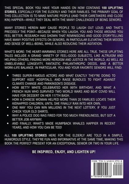 Packed with 100 uplifting short stories in large print font size, this book is perfect for the elderly and senior citizens. The primary goal of this collection is to engage the reader with delightful and stimulating stories. Many stories herein may cause people to laugh out loud. And that's precisely the point-because a laugh a day keeps the doctor away! Research has shown that reminiscing and good storytelling have many positive effects on seniors, in particular, elevating their moods and sense of well-being while also reducing their agitation. In this book you'll find: · 100 heart-warming true stories on a variety of subjects like altruism, heroism and justice in the world.· Stories specifically written to keep the reader's mind engaged and even crack up a laugh!· Large print font size and short paragraphs to make it easy to read. All 100 uplifting stories here for the elderly are told in a simple, humorous style. They're fun and informative at the same time, making this book the perfect present for an exceptional senior or two in your life. Be inspired, enjoy, and lighten up!