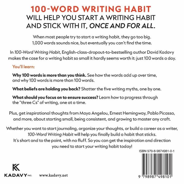 100-Word Writing Habit will help you start a writing habit and stick with it, once and for all. When most people try to start a writing habit, they go too big. 1,000 words sounds nice, but eventually you can't find the time. In 100-Word Writing Habit, English-class-dropout-to-bestselling author David Kadavy makes the case for a writing habit so small it hardly seems worth it: just 100 words a day. You'll learn: * Why 100 words is more than you think. See how the words add up over time, and why 100 words is more than 100 words. * What beliefs are holding you back? Shatter the five writing myths, one by one. * What should you focus on to ensure success? Learn how to progress through the "three Cs" of writing, one at a time. Plus, get inspirational thoughts from Maya Angelou, Ernest Hemingway, Pablo Picasso, and more, about starting small, being consistent, and growing to master any craft. Whether you want to start journaling, organize your thoughts, or build a career as a writer, 100-Word Writing Habit will help you finally build a habit that sticks. It's short and to the point, with no fluff. So you can get the inspiration and direction you need to start your writing habit today!