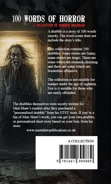 A drabble is a story of 100 words exactly. The word-count does not include the story's title. This collection contains 100 drabbles. Some stories are funny, some stories are tragic. There are some which are stomach-churning and there are some which are borderline offensive. The collection is not suitable for readers under the age of eighteen. Nor is it suitable for those who are easily offended.
