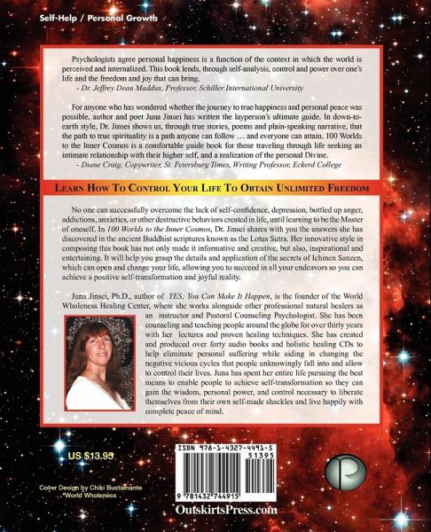 No one can successfully overcome the lack of self-confidence, depression, bottled up anger, addictions, anxieties, or other destructive behavior created in life, until learning to be the Master of Oneself. In 100 Worlds to the Inner Cosmos, Dr. Jinsei shares with you the answers she has discovered in the ancient Buddhist scriptures known as the Lotus Sutra. Her innovative style in composing this book has not only made it informative and creative, but also, inspirational and entertaining. It will help you grasp the details and application of the secrets of Ichinen Sanzen, which can open and change your life, allowing you to succeed in all your endeavors so you can achieve a positive self-transformation and joyful reality. Psychologists agree personal happiness is a function of the context in which the world is perceived and internalized. Dr. Jinsei utilizes real life examples to present a philosophical framework for understanding ten major emotional tendencies and operational personality types, plus 100 subtypes, that one encounters in the world. This book lends the reader, through a self-analysis framework, control and power over one's life and the freedom and joy that can bring. -Dr. Jeffrey Dean Maddux, Professor, Schiller International University Juna Jinsei, Ph.D., author of YES; You Can Make It Happen, is the founder of the World Wholeness Healing Center, where she works alongside other professional natural healers as an instructor and Pastoral Counseling Psychologist. She has been counseling and teaching people around the globe for over thirty years with her lectures and proven healing techniques. She has created and produced over forty audio books and holistic healing CDs to help eliminate personal suffering while aiding in changing the negative vicious cycles that people unknowingly fall into and allow to control their lives. Juna has spent her entire life pursuing the best means to enable people to achieve self-transformation so they can gain the wisdom, personal power, and control necessary to liberate themselves from their own self-made shackles and live happily with complete peace of mind.