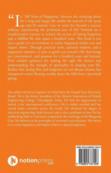 In '100 Years of Happiness, ' discover the enduring desire for a long and happy life amidst the marvels of the space age and AI systems. Can we truly live beyond a century without experiencing the profound joys of life? Embark on a transformative journey to unlock the secrets of lasting happiness and a fulfilled life that spans a hundred years. This book is not just a guide; it's an invitation to realize happiness within you and inspire others. Through practical tools, spiritual wisdom, and a supportive narrative, it aims to guide you toward a life that brings joy, contentment, and purpose for a hundred years and beyond. Find valuable guidance for making the right life choices and understanding the strength of spirituality in shaping your life. Realize that lasting bliss and longevity are not distant dreams but transparent waters flowing steadily down the hills from a perennial spring.