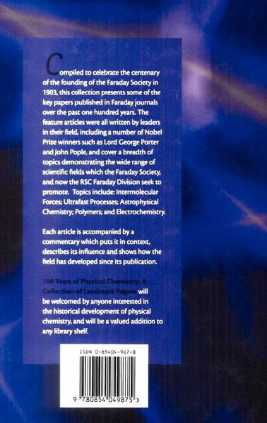Compiled to celebrate the centenary of the founding of the Faraday Society in 1903, this collection presents some of the key papers published in Faraday journals over the past one hundred years. The feature articles were all written by leaders in their field, including a number of Nobel Prize winners such as Lord George Porter and John Pople, and cover a breadth of topics demonstrating the wide range of scientific fields which the Faraday Society, and now the RSC Faraday Division, seek to promote. Topics include: Intermolecular Forces; Ultrafast Processes; Astrophysical Chemistry; Polymers; and Electrochemistry.Each article is accompanied by a commentary which puts it in context, describes its influence and shows how the field has developed since its publication. TOC:Intermolecular Forces; Clusters; Molecular Spectroscopy; Magnetic Resonance; Quantum Chemistry; Photochemical Dynamics; Gas-Phase Kinetics; Ultrafast Processes; Molecular Reaction Dynamics; Atmospheric Chemistry; Astrophysical Chemistry; Theoretical Dynamics; Statistical Thermodynamics; Polymers; Colloids; Liquid Crystals; Liquid-Solid Interfaces: Liquid-Liquid Interfaces; Electrochemistry; Gas-Solid Surface Science; Biophysical Chemistry; Solid State Chemistry; Catalysis