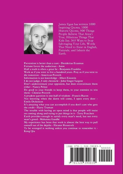 Prevention is better than cure. - Desiderius Erasmus Fortune favors the audacious. - Anon Half a truth is often a great lie. - Benjamin Franklin Work as if you were to live a hundred years. Pray as if you were to die tomorrow. - American Proverb A countryman between two lawyers is like a fish between two cats. - North American Proverb A nail is driven out by another nail. Habit is overcome by habit. - Desiderius Erasmus He who allows oppression shares the crime. - Dutch Proverb Information is not knowledge. - Albert Einstein Small is the number of people who see with their eyes and think with their minds. - Zen Proverb To find joy in work is to discover the fountain of youth. - Pearl S. Buck I do not judge, I only chronicle. - John Singer Sargent Don't underestimate your opponent, but don't overestimate them, either. - Nancy Pelosi Do good to your friends to keep them, to your enemies to win them. - Chinese Proverb Only the educated are free. - Greek Proverb