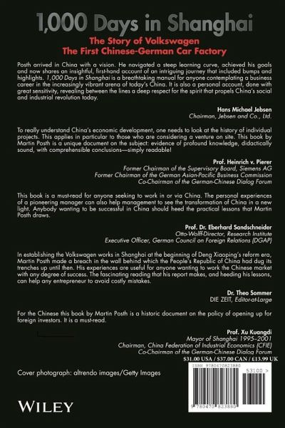 Posth arrived in China with a vision. He navigated a steep learning curve, achieved his goals and now shares an insightful, first-hand account of an intriguing journey that included bumps and highlights. 1,000 Days in Shanghai is a breathtaking manual for anyone contemplating a business career in the increasingly vibrant arena of today's China. It is also a personal account, done with great sensitivity, revealing between the lines a deep respect for the spirit that propels China's social and industrial revolution today.--Hans Michael Jebsen, Chairman, Jebsen and Co., Ltd. To really understand China's economic development, one needs to look at the history of individual projects. This applies in particular to those who are considering a venture on site. This book by Martin Posth is a unique document on the subject: evidence of profound knowledge, didactically sound, with comprehensible conclusions--simply readable!--Prof. Heinrich v. Pierer, Former Chairman of the Supervisory Board, Siemens AG Former Chairman of the German Asian-Pacific Business Commission Co-Chairman of the German-Chinese Dialog Forum This book is a must-read for anyone seeking to work in or via China. The personal experiences of a pioneering manager can also help management to see the transformation of China in a new light. Anybody wanting to be successful in China should heed the practical lessons that Martin Posth draws.--Prof. Dr. Eberhard Sandschneider, Otto-Wolff-Director, Research Institute Executive Officer, German Council on Foreign Relations (DGAP) In establishing the Volkswagen works in Shanghai at the beginning of Deng Xiaoping's reform era, Martin Posth made a breach in the wall behind which the People's Republic of China had dug its trenches up until then. His experiences are useful for anyone wanting to work the Chinese market with any degree of success. The fascinating reading that his report makes, and heeding his lessons, can help any entrepreneur to avoid costly mistakes.-- Dr. Theo Sommer, DIE ZEIT, Editor-at-Large For the Chinese, this book by Martin Posth is a historic document on the Open Door Policy for foreign investors. It is a must-read.--Prof. Xu Kuangdi, Mayor of Shanghai 1995-2001, Chairman China Federation of Industrial Economics (CFIE), Co-Chairman of the German-Chinese Dialog Forum