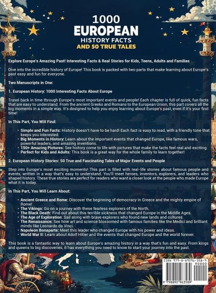 Explore Europe's Amazing Past! Interesting Facts & Real Stories for Kids, Teens, Adults and Families Dive into the incredible history of Europe! This book is packed with two parts that make learning about Europe's past easy and fun for everyone. Two Manuscripts in One: 1. European History: 1000 Interesting Facts About Europe Travel back in time through Europe's most important events and people! Each chapter is full of quick, fun facts that are easy to understand. From the ancient Greeks and Romans to the European Union, this part covers all the big moments in a simple way. It's designed to help you enjoy learning about Europe's past, even if it's your first time! In This Part, You Will Find: 1. * Simple and Fun Facts: History doesn't have to be hard! Each fact is easy to read, with a friendly tone that keeps you interested. * Big Moments in History: Learn about the important events that changed Europe, like famous wars, powerful leaders, and amazing inventions. * 150+ Amazing Pictures: See history come to life with pictures that make the facts feel real and exciting. * Perfect for Kids and Adults: This book is a great way for the whole family to learn together! 2. European History Stories: 50 True and Fascinating Tales of Major Events and People Step into Europe's most exciting moments! This part is filled with real-life stories about famous people and events, written in a way that's easy to understand. You'll meet heroes, inventors, explorers, and leaders who shaped history. These true stories are perfect for readers who want a closer look at the people who made Europe what it is today. In This Part, You Will Learn About: 2. * Ancient Greece and Rome: Discover the beginning of democracy in Greece and the mighty empire of Rome! * The Vikings: Go on a journey with these fearless explorers of the North. * The Black Death: Find out about this terrible sickness that changed Europe in the Middle Ages. * The Age of Exploration: Sail along with brave explorers who found new lands and cultures. * The Renaissance: See how art and science blossomed with famous families like the Medici and brilliant minds like Leonardo da Vinci. * Napoleon Bonaparte: Meet this leader who changed Europe with his power and ideas. * World War II: Learn about Adolf Hitler and the events that changed Europe and the world forever.