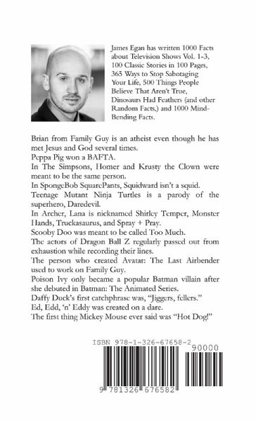 Brian from Family Guy is an atheist even though he has met Jesus and God several times. Peppa Pig won a BAFTA. In The Simpsons, Homer and Krusty the Clown were meant to be the same person. In SpongeBob SquarePants, Squidward isn't a squid. Teenage Mutant Ninja Turtles is a parody of the superhero, Daredevil. The makers of South Park can create an episode in two days. In Archer, Lana is nicknamed Shirley Temper, Monster Hands, Truckasaurus, and Spray + Pray. Scooby Doo was meant to be called Too Much. The actors of Dragon Ball Z regularly passed out from exhaustion while recording their lines. The person who created Avatar: The Last Airbender used to work on Family Guy. Poison Ivy only became a popular Batman villain after she debuted in Batman: The Animated Series. Daffy Duck's first catchphrase was, "Jiggers, fellers." Ed, Edd, 'n' Eddy was created on a dare. The first thing Mickey Mouse ever said was "Hot Dog!"