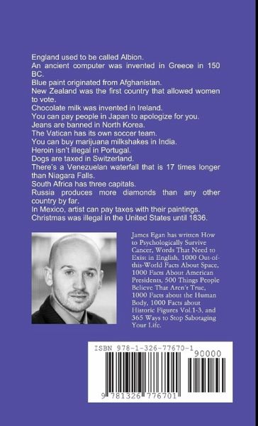 England used to be called Albion. An ancient computer was invented in Greece in 150 BC. Blue paint originated from Afghanistan. New Zealand was the first country that allowed women to vote. Chocolate milk was invented in Ireland. You can pay people in Japan to apologize on your behalf. Jeans are banned in North Korea. The Vatican has its own soccer team. You can buy marijuana milkshakes in India. Heroin isn't illegal in Portugal. Dogs are taxed in Switzerland. There's a Venezuelan waterfall that is 17 times longer than Niagara Falls. South Africa has three capitals. Russia produces more diamonds than any other country by far. In Mexico, artist can pay taxes with their paintings. Christmas was illegal in the United States until 1836.