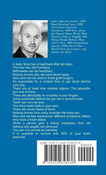 A baby fetus has a heartbeat after ten days. The liver has 300 functions. Birthmarks can be hereditary. Nobody knows why we have blood types. Sea coral can be used in bone graft surgery. It's impossible for a contact lens to get stuck behind your eye. There are at least nine useless organs. The appendix isn't one of them. There are absolutely no muscles in your fingers. Some scientists believe the gut has a second brain. Teeth can survive lava. You have taste buds in your ears. Nobody has a clue how many muscles the human body has. There are seven types of twins. Men and women experience different symptoms before they have a heart attack. When a person gets a kidney transplant, their old kidneys are usually not removed. There is only one muscle that can't get tired. You can survive without an intestine. It is possible to survive with 90%% of your brain removed.