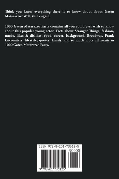 Think you know everything there is to know about about Gaten Matarazzo? Well, think again. 1000 Gaten Matarazzo Facts contains all you could ever wish to know about this popular young actor. Facts about Stranger Things, fashion, music, likes & dislikes, food, career, background, Broadway, Prank Encounters, lifestyle, quotes, family, and so much more all awaits in 1000 Gaten Matarazzo Facts.