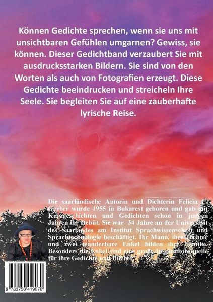 Können Gedichte sprechen, wenn sie uns mit unsichtbaren Gefühlen umgarnen? Gewiss, sie können. Dieser Gedichtband verzaubert Sie mit ausdrucksstarken Bildern. Sie sind von den Worten als auch von Fotografien erzeugt. Diese Gedichte beeindrucken und streicheln Ihre Seele. Sie begleiten Sie auf eine zauberhafte lyrische Reise.