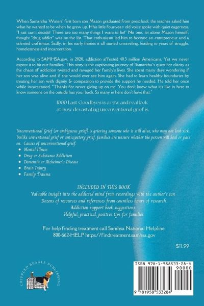In 2016, Samantha Waters was emailing Mike Rowe for a spot on Dirty Jobs to promote her son's successful construction company. Just three years later she was calling the morgue and checking booking reports daily for her son's name. Her son's fall from entrepreneur to homeless addict was brutal and heartbreaking. Samantha could hardly believe the devastation addiction had on her family, and she was determined to heal it. Unconventional grief, also known as ambiguous grief, is mourning someone who is still alive. Unlike conventional grief or anticipatory grief, families are unsure whether the person will get better or pass on. Substance use is one cause of ambiguous grief, as every single day could be the last. For over five years, Samantha Waters waited for that phone call while simultaneously searching every nook and cranny for a "cure." She prayed, begged, and borrowed for one more day to get her son well. The pages of 1000 Last Goodbyes detail the compelling, raw story of a mom who refused to give up.