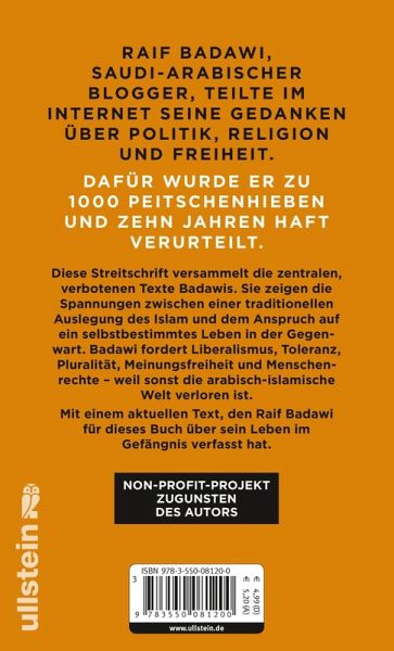 Raif Badawi, saudi-arabischer Blogger, teilte im Internet seine Gedanken über Politik, Religion und Freiheit. Dafür wurde er zu 1000 Peitschenhieben und zehn Jahren Haft verurteilt. Diese Streitschrift versammelt die zentralen, verbotenen Texte Badawis. Sie zeigen die Spannungen zwischen einer traditionellen Auslegung des Islam und dem Anspruch auf ein selbstbestimmtes Leben in der Gegenwart. Badawi fordert Liberalismus, Toleranz, Pluralität, Meinungsfreiheit und Menschenrechte - weil sonst die arabisch-islamische Welt verloren ist. Mit einem aktuellen Text, den Raif Badawi für dieses Buch über sein Leben im Gefängnis verfasst hat.