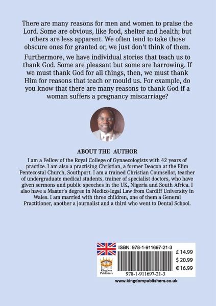 There are many reasons for men and women to praise the Lord. Some are obvious, like food, shelter and health; but others are less apparent. We often tend to take those obscure ones for granted or, we just don't think of them. Furthermore, we have individual stories that teach us to thank God. Some are pleasant but some are harrowing. If we must thank God for all things, then, we must thank Him for reasons that teach or mould us.Johnson's book is a veritable encyclopaedia of reasons to praise God. A treasure trove of stories and lessons learned through life's experiences and a lifetime of service as a doctor and Obstetrician-Gynaecologist. A rich compendium of real-life stories and some personal confessions! All seasoned with Johnson's unique African-Nigerian history and perspective. Truly refreshing, uplifting, inspiring, motivating, empowering.
