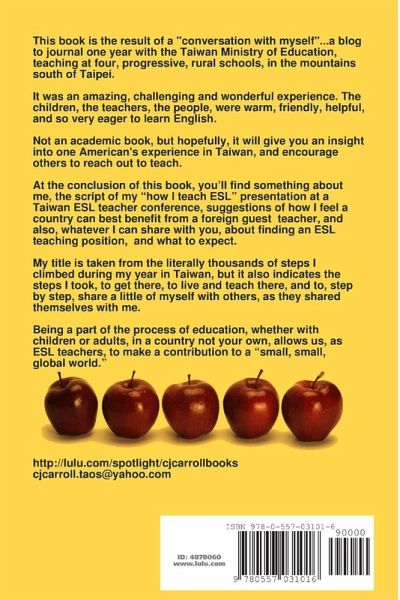 My title is taken from the literally thousands of steps I climbed during my year teaching ESL in Taiwan, but it also indicates the steps I took, to get there, to live and teach there, and to, step by step, share a little of myself with others, as they shared themselves with me. Being a part of the process of education, whether with children or adults, in a country not your own, allows us, as teachers, to make a contribution to our "small, small, global world."