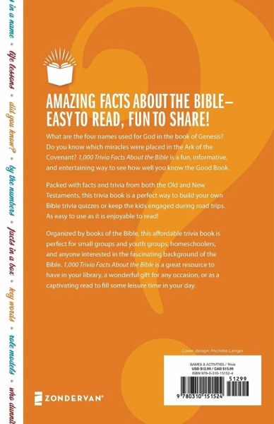 1,000 Trivia Facts About the Bible?is a fun, informative, and entertaining way to see how well you know the Good Book. This trivia book is perfect for people of all ages and is a great resource for families or church groups.