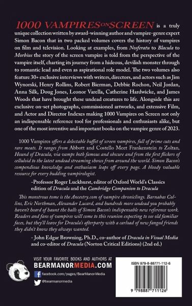 1000 Vampires on Screen is a truly unique collection written by award-winning author and vampire-genre expert Simon Bacon that in two packed volumes covers the history of vampires on film and television. Looking at examples, from Nosferatu to Duckula, Blacula to Twilight, and Dark Shadows to True Blood the story of the screen vampire from its first appearance on film is told from the perspective of the vampire itself, charting its journey from a hideous, devilish monster through to romantic lead and even as aspirational role model. It is a trip that takes us around the globe, to countries in every continent, and even some places in outer space, encompassing bloodsuckers, energy-drinkers, soul-takers, life-absorbers, body-copiers, man-eating-plants, possessed objects, sexoholics, eternal lovers, and vegetarian vampires, to name but a few. Further to this, the two volumes of 1000 Vampires on Screen also features 30+ exclusive interviews with the writers, directors, and actors that have brought these undead creatures to life. Jim Wynorski, Henry Rollins, Robert Bierman, Debbie Rochon, Neil Jordan, Anna Silk, Doug Jones, Leonor Varella, Catherine Hardwicke, and James Woods amongst many others discuss what glamoured them about the vampire, how they became them on screen, and why, so many of them, returned to its embrace again and again. Many of them also share exclusive and personal onset photographs, design images, and publicity shots to give new perspectives on themselves and on the vampires they created. All of this is supported by cross-reference notes on all the entries and extensive Film, and Actor and Director Indexes making 1000 Vampires on Screen not only an indispensable reference tool for professionals and enthusiasts alike, but one of the most inventive and important books on the vampire genre of 2023. 1000 Vampires offers a delectable buffet of screen vampires, full of prime cuts and rare meats. It ranges from Abbott and Costello Meet Frankenstein to Zoltan, Hound of Dracula, via vamps both famous and obscure and from the first flickers of celluloid to the latest undead streaming shows from around the world. Simon Bacon's compendious knowledge and enthusiasm leaps off every page. A bloody valuable resource for every budding vampirologist. -Professor Roger Luckhurst, editor of Oxford World's Classics edition of Dracula and the Cambridge Companion to Dracula