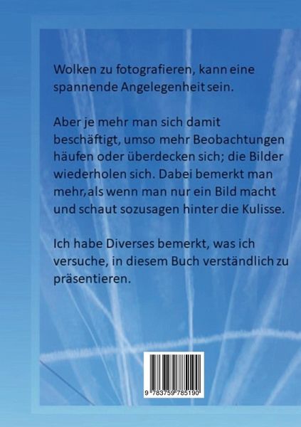 Natur-Beobachtungen, Himmels-Raub. Wolken zu fotografieren, kann eine spannende Angelegenheit sein. Aber je mehr man sich damit beschäftigt, umso mehr Beobachtungen häufen oder überdecken sich: die Bilder wiederholen sich. Dabei bemerkt man mehr, als wenn man nur ein Bild macht und schaut sozusagen hinter die Kulisse. Der Autor hat Diverses bemerkt, was er versucht, in diesem Buch verständlich zu präsentieren.
