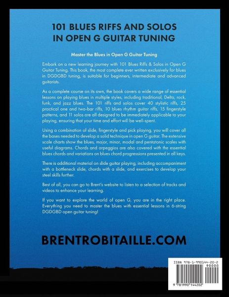 Master the Blues in Open G Guitar Tuning (DGDGBD) 101 Blues Riffs & Solos in Open G Guitar Tuning is the most complete book ever written exclusively for blues in DGDGBD tuning. It is suitable for beginners and intermediate guitarists and an excellent reference for advanced guitarists. Guitarist Brent Robitaille has written over 50 instructional guitar books and is recommended by students worldwide. Brent is a well-known session guitarist who has recorded extensively and specializes in altered tunings and blues. His latest book, 101 Blues Riffs & Solos in Open G Tuning, is a complete course covering a wide range of essential blues styles, including traditional, Delta, rock, funk, and jazz blues. The 101 riffs and solos cover stylistic riffs, practical one- and two-bar riffs, blues rhythm guitar riffs, fingerstyle patterns, slide guitar, and solos, all designed to be immediately applicable to your playing, ensuring that your time and effort will be well-spent. Using a combination of slide, fingerstyle, and pick playing, you will cover all the bases needed to develop a solid blues technique in open G guitar. Refer regularly to the extensive scale charts, which show the blues, major, minor, modal, and pentatonic scales, chords and arpeggio patterns, essential blues chords and progressions presented in all keys. Additional material on slide guitar playing includes accompaniment with a bottleneck slide, chords with slide and fingers, and exercises to develop your steel skills further. Best of all, you can go to Brent's website to listen to all the audio tracks and a selection of videos to enhance your learning. If you want to begin or continue exploring the world of open G, you are in the right place. Everything you need to master the blues with essential lessons in 6-string DGDGBD open guitar tuning!