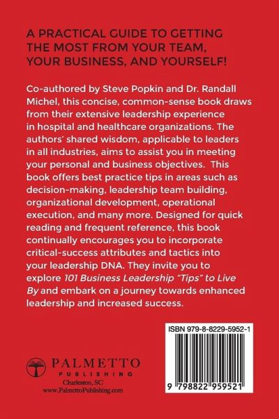 Boost Your Leadership Skills: Essential Guide to Optimizing Decision Making, Operational Execution, Organizational Development and More for Business Success. 101 Business Leadership "Tips" to Live By is a practical common-sense guide to enhancing your leadership abilities. The book's best practice leadership tips, applicable to all types of businesses, will help you focus on what it takes to make sound decisions, optimize your leadership team, keep your eye on the important things, execute your strategic and operational plans, become and stay organized, communicate effectively, enhance employee engagement, and much more. Designed for quick reading and frequent reference, this book continually encourages you to incorporate critical-success attributes and tactics into your leadership DNA. Penned by Steve Popkin and Dr. Randall Michel, drawing from their extensive experience in leading hospitals and healthcare organizations, they share the leadership tips they've acquired over more than 40 years. They invite you to explore 101 Business Leadership "Tips" to Live By and embark on a journey towards enhanced leadership and increased success.