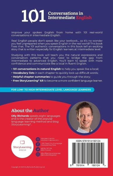 Real English-speaking people don't speak like your textbook... so it's no wonder you feel unprepared when it's your turn to speak! Try the StoryLearning method, and dive into a real-world, gripping drama between six characters that helps you learn natural spoken English in the process. Created by Olly Richards, internationally-renowned language teacher and author, this proven method of the immersive experience not only entertains, it gives you the skills to master realistic encounters in shops, cafes, and other, everyday scenarios! In this story, when a mysterious painting appears on the wall of the Tate Museum, Detective Laura Smith is called in to investigate. Soon, she discovers that the painting is full of clues about five different crimes that will be committed somewhere in London by the end of the day. As the race around the city to stop this crime wave starts, more questions arise: Who is behind this network of organized crime? And who is trying to warn Detective Smith? As the story unfolds, you'll learn typical expressions in typical English and neutral dialogue that are used in English-speaking communities all over the world. And get full confidence in the words, phrases and expressions you need to blend in with the locals wherever you go! Here's what you'll get: 101 English conversations with over 15,000 words of dialogue - an unparalleled resource that will immerse you in English at a level you can easily understand and reproduce; Expressions that real people use on the street. You'll sound more authentic when you speak and make English-speaking friends more easily; Situational English dialogues that help you thrive in typical daily circumstances, so meeting people and making everyday arrangements will become second nature; Conversations that are accessible for intermediate learners (B1-B2 on the CEFR), so you can speak confidently, even with strangers; Each conversation is limited to around 15 lines of dialogue (150 words) to help you master the expressions more quickly, and keep you moving toward the finish line. Unlock the simple genius that makes learning Italian a breeze in "101 Conversations in Intermediate English." You'll improve your spoken English, impress native speakers, and catapult your fluency to new heights!