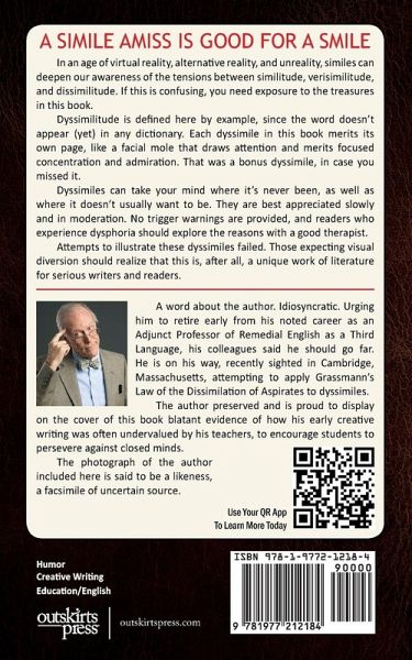 101 DYSSIMILES is an assortment of similes written to entertain the reader with inappropriate comparisons, extraneous information, unrelated comments, irrelevant details, and jarring contrasts. In short, the dyssimiles collected here are invariably dysfunctional in various ways, and as such may instill in creative writers and readers a better sense and appreciation of what constitutes an effective simile. The book is intended to amuse both writers and readers, and to suggest to serious students of writing-style what to avoid when creating a comparison in the form of a well-conceived and well–written simile. Many of the dyssimiles presented here may also be considered a form of farce and satire in one sentence, appealing to writers and readers who appreciate these forms of humor. Teachers of English writing and literature may exploit the amusing nature of these dyssimiles to arouse the interest of their students as they explore the nature and uses of appropriate and effective simile. There are references to scatological and sexual matters, but most of the material is appropriate at the high school level, all of it at the university level. There are no trigger warnings, and teachers will want to preview the material. Dyssimiles tend to be appreciated by those who are entertained by a bad pun.