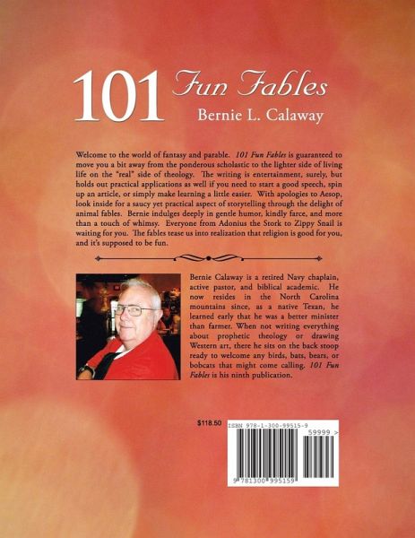 Bernie Calaway is a retired Navy chaplain and biblical scholar, positions attained not without some struggle. He's a native Texan who quickly learned he'd be a happier minister than a cotton farmer on the high plains. Now, in active retirement, he writes, draws, takes regular naps, and tries to keep the squirrels ö the back stoop. Bernie is the author of eight nonfiction books and two collections of entertaining fables. Titles in the marketplace today include Revealing the Revelation, Discernment from Daniel, Revelation for Regular Readers, Operation Revelation: A Teen's Guide to Earth's Final Curtain (with a co-author), and Oracles from Olivet: The Eschatological Jesus. The latest is a five volume encyclopedia of biblical terms entitled History and Mystery: The Complete Eschatological Encyclopedia of Prophecy, Apocalypticism, Mythos, and Worldwide Dynamic Theology. 101 Fun Fables is a treasury of animal fables, stories that are both practicable and whimsical.