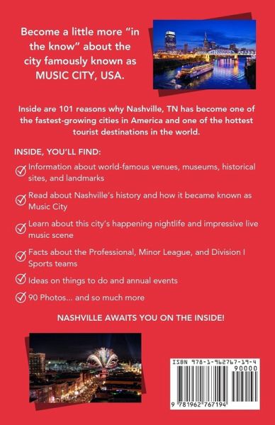 ** The Paperback, Hardcover, and eBook are ALL in FULL-COLOR! ** Are you a local that loves Nashville? Are you, or someone you know, planning a visit to Music City? Then you need this fun and entertaining full-color book! Inside are 101 reasons why Nashville, TN has become one of the fastest-growing cities in America and one of the hottest tourist destinations in the world. With carefully selected facts and numerous topics covered, even a local to Nashville will surely learn something new. What's included in this pocket-sized fact book:Information about world-famous venues, museums, historical sites, and landmarks scattered around the city. Read about Nashville's history and how it became known as a music mecca for songwriters, musicians, artists, and industry professionals. Learn why this city has such a happening nightlife with an impressive live music scene. Facts about the Professional, Minor League, and Division I sports teams associated with Nashville. From southern cookin' to exquisite chef-prepared meals, see why Nashville has a delicious history with food. Ideas on things to do and annual events. 90 Photos in full color... and so much more. A quick read that gets straight to the facts, this informative guide is a great resource, gift, or coffee table book. NASHVILLE AWAITS YOU ON THE INSIDE!