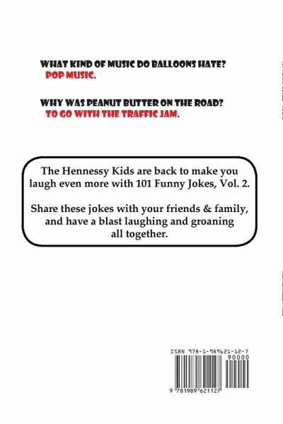 What kind of music do balloons hate? Pop Music Why was peanut butter on the road? To go with the traffic jam. The Hennessy Kids are back to make you laugh even more with 101 Funny Jokes, Vol. 2. Share these jokes with your friends & family, and have a blast laughing and groaning all together. Plus, it includes artwork and even a few activities, and it's fun for kids of all ages.