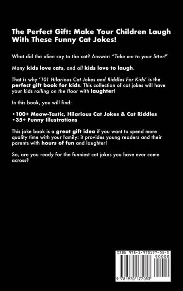 The Perfect Funny Gift for Kids   Make Your Children Laugh With These Hilarious Cat Jokes! What did the alien say to the cat? Answer: "Take me to your litter!" Many kids love cats, and all kids love to laugh. That is why '101 Hilarious Cat Jokes and Riddles For Kids' is the perfect gift book for kids. This collection of cat jokes will have your kids rolling on the floor with laughter! Why You Should Get Your Paws On '101 Hilarious Cat Jokes & Riddles For Kids': In this book, you will find: - 100+ Meow-Tastic, Hilarious Cat Jokes & Cat Riddles - 35+ Funny Illustrations This joke book is a great gift idea if you want to spend more quality time with your family: it provides young readers and their parents with hours of fun and laughter! BUY: '101 Hilarious Cat Jokes & Riddles For Kids' Sample Jokes Will You Find Inside: Q: Where do cats go after their tails fall off? A: The re-tail store! *** Q: Who delivers presents to cats? A: Santa Claws! *** Q: What is a cat's favorite car? A: a Catillac Buy '101 Hilarious Cat Jokes & Riddles For Kids', and you will get access to all the other jokes. Finally, as a FREE & EXCLUSIVE BONUS, you're also getting 11 super funny jokes from my popular book '101 Hilarious Dog Jokes For Kids.' So, are you ready for the funniest cat jokes you have ever come across? Take action now! Scroll to the top of this page and click the 'Buy Now' button.