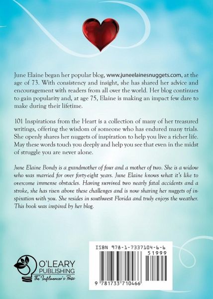 June Elaine began her popular blog, www.juneelainesnuggets.com, at the age of 73. With consistency and insight, she has shared her advice and encouragement with readers from all over the world. Her blog continues to gain popularity and, at age 75, Elaine is making an impact few dare to make during their lifetime. 101 Inspirations from the Heart is a compilation of many of her treasured writings, offering the wisdom of someone who has endured many trials. She openly shares her nuggets of inspiration to help you live a richer life. May these words touch you deeply and help you see that even in the midst of struggle you are never alone.