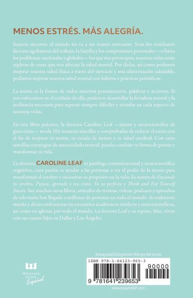 La Dra. Caroline Leaf es una patóloga de la comunicación y neurocientífica cognitiva cuya pasión es ayudar a las personas a ver el poder de la mente para cambiar el cerebro y encontrar su propósito en la vida. Es autora de Switch On Your Brain, Think and Eat Yourself Smart, The Perfect You y Think, Learn, Succeed, entre muchos otros libros y artículos de revistas, y sus videos, podcasts y episodios de televisión han llegado a millones de personas en todo el mundo. Actualmente enseña en varias conferencias académicas, médicas y de neurociencia, así como en iglesias de todo el mundo. La Dra. Leaf y su esposo, Mac, viven con sus cuatro hijos en Dallas y Los Ángeles. ----- Dr. Caroline Leaf is a communication pathologist and cognitive neuroscientist whose passion is to help people see the power of the mind to change the brain and find their purpose in life. She is the author of Switch On Your Brain, Think and Eat Yourself Smart, The Perfect You, and Think, Learn, Succeed, among many other books and journal articles, and her videos, podcasts, and TV episodes have reached millions globally. She currently teaches at various academic, medical, and neuroscience conferences, as well as in churches around the world. Dr. Leaf and her husband, Mac, live with their four children in Dallas and Los Angeles.