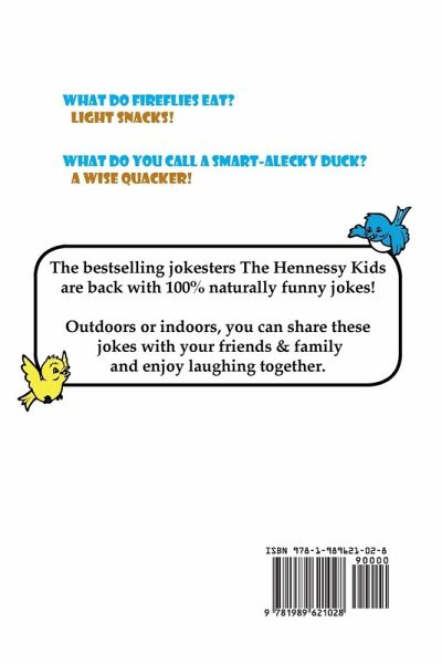 What do fireflies eat? Light snacks! The bestselling jokesters The Hennessy Kids are back with a bunch of 100% naturally funny jokes! Whether you are at the park, camping in the woods, or sitting at home, you can share these jokes with friends & family so you can all enjoy laughing together for a fun time. The Hennessy Kids are authors of the bestselling joke books 101 Halloween Jokes, 101 Christmas Jokes, 101 Pet Jokes, and 101 Knock Knock Jokes (Volume 1).
