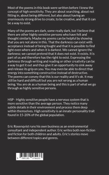 A few years ago, I came into contact with the concept high sensitivity and HSP (high sensitive person). I read books, websites, stories from other highly sensitive persons and did tests. It was very clear to me that I was a highly sensitive person. It didn't change my reality, but it gave me explanations for why I always felt different, why I didn't seem to be able to function like others.Most of the poems in this book were written before I knew the concept of high sensitivity. They are about searching, about not fitting in, about being different, but also about having an enormously strong drive to create, to be creative, and that it can be a way to exist. Many of the poems are dark, some really dark, but I believe that there are other highly sensitive persons who have felt and thought similarly. Maybe my poems can be helpful by showing that you are not alone in this. That the darkness can exist with acceptance instead of being fought and that it is possible to find light even where and when it is darkest. We cannot ignore the darkness; we cannot pretend that it does not exist. It exists. It is part of us and therefore has the right to exist. Expressing the darkness through writing and reading or other creativity can be a way to get it out and thus give it an opportunity to sink away and release its grip on you. You may even be able to direct that energy into something constructive instead of destructive.The poems can convey that this is our reality and it's ok. It may still be hard and difficult but you are not wrong as a human being. You are ok as a human being and this is part of what we go through as highly sensitive persons.HSP - Highly sensitive people have a nervous system that is more sensitive than the average person. They notice many subtle details in their environment and process them deep within themselves. High sensitivity is an innate personality trait found in 15-20% of the global population.