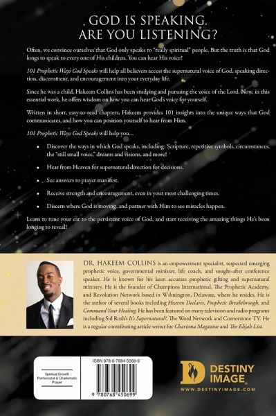 God is speaking. Are you listening? Often, we convince ourselves that God only speaks to "really spiritual" people. But the truth is that God longs to speak to every one of His children. You can hear His voice! 101 Prophetic Ways God Speaks will help all believers access the supernatural voice of God, speaking direction, discernment, and encouragement into your everyday life. Since he was a child, Hakeem Collins has been studying and pursuing the voice of the Lord. Now, in this essential work, he offers wisdom on how you can hear God’s voice for yourself. Written in short, easy-to-read chapters, Hakeem provides 101 insights into the unique ways that God communicates, and how you can position yourself to hear from Him. 101 Prophetic Ways God Speaks will help you… Discover the ways in which God speaks, including: Scripture, repetitive symbols, circumstances, the "still small voice," dreams and visions, and more! Hear from Heaven for supernatural direction for decisions. See answers to prayer manifest. Receive strength and encouragement, even in your most challenging times. Discern where God is moving, and partner with Him to see miracles happen. Learn to tune your ear to the persistent voice of God, and start receiving the amazing things He’s been longing to reveal!