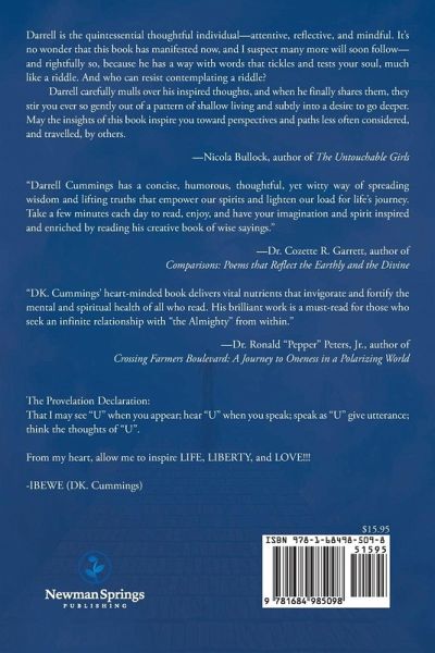 Darrell is the quintessential thoughtful individual--attentive, reflective, and mindful. It's no wonder that this book has manifested now, and I suspect many more will soon follow--and rightfully so, because he has a way with words that tickles and tests your soul, much like a riddle. And who can resist contemplating a riddle? Darrell carefully mulls over his inspired thoughts, and when he finally shares them, they stir you ever so gently out of a pattern of shallow living and subtly into a desire to go deeper. May the insights of this book inspire you toward perspectives and paths less often considered, and travelled, by others. --Nicola Bullock, author of The Untouchable Girls "Darrell Cummings has a concise, humorous, thoughtful, yet witty way of spreading wisdom and lifting truths that empower our spirits and lighten our load for life's journey. Take a few minutes each day to read, enjoy, and have your imagination and spirit inspired and enriched by reading his creative book of wise sayings." Dr. Cozette R. Garrett, author of Comparisons: Poems that Reflect the Earthly and the Divine "DK. Cummings' heart-minded book delivers vital nutrients that invigorate and fortify the mental and spiritual health of all who read. His brilliant work is a must-read for those who seek an infinite relationship with "the Almighty" from within." Dr. Ronald "Pepper" Peters, Jr., author of Crossing Farmers Boulevard: A Journey to Oneness in a Polarizing World The Provelation Declaration: That I may see "U when you appear; hear "U" when you speak; speak as "U" give utterance; think the thoughts of "U". From my heart, allow me to inspire LIFE, LIBERTY, and LOVE !!! -IBEWE (DK. Cummings)