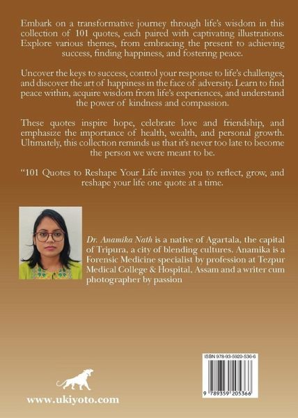 Embark on a transformative journey through life's wisdom in this collection of 101 quotes, each paired with captivating illustrations. Explore various themes, from embracing the present to achieving success, finding happiness, and fostering peace. Uncover the keys to success, control your response to life's challenges, and discover the art of happiness in the face of adversity. Learn to find peace within, acquire wisdom from life's experiences, and understand the power of kindness and compassion. These quotes inspire hope, celebrate love and friendship, and emphasize the importance of health, wealth, and personal growth. Ultimately, this collection reminds us that it's never too late to become the person we were meant to be. "101 Quotes to Reshape Your Life invites you to reflect, grow, and reshape your life one quote at a time.