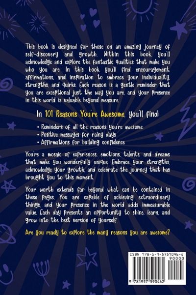 The Perfect Gift for Anyone! This book was designed for those on an amazing journey of self-discovery and growth. Within this book, you'll acknowledge and explore the fantastic qualities that make you who you are. In this book, you'll find encouragement, affirmations, and inspiration to embrace your individuality, strengths, and quirks. Each reason is a gentle reminder that you are exceptional just the way you are, and your presence in this world is valuable beyond measure. In this book, you'll find:Reminders of all the reasons you're awesome Positive messages for rainy days Affirmations for building confidence You're a mosaic of experiences, emotions, talents, and dreams that make you wonderfully unique. Embrace your strengths, acknowledge your growth, and celebrate the journey that has brought you to this moment. Your worth extends far beyond what can be contained in these pages. You are capable of achieving extraordinary things, and your presence in the world adds immeasurable value. Each day presents an opportunity to shine, learn, and grow into the best version of yourself.