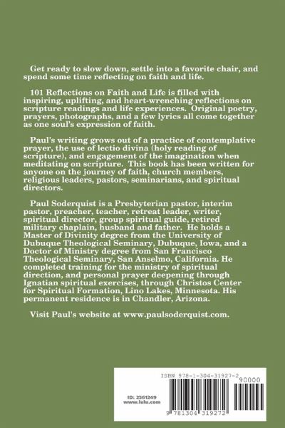 Get ready to slow down, settle into a favorite chair, and spend some time growing closer to God. This book is filled with 101 inspiring, uplifting, and sometimes heart-wrenching reflections on scripture readings and life experiences. Original poetry, prayers, writings, photographs, and lyrics all come together as one soul's expression of faith. Written by a Christian, Presbyterian pastor for anyone on the journey of faith, church members, religious leaders, pastors, seminarians, and spiritual directors. Draws upon the practice of contemplative prayer, the use of lectio divina (holy reading of scripture), and engagement of the imagination when meditating on scripture.