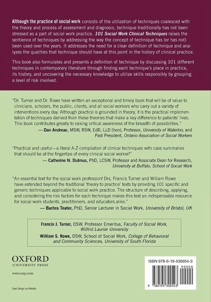 This book addresses the concept of Technique and its place in contemporary practice of Social Work. It does so by reviewing the concept of technique, analyzing the necessary component parts of a definition, formulating a definition, then presenting a discussion of the nature and use of 101 Techniques for Clinical Social Work practice.