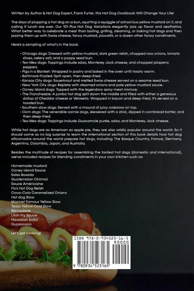Written by Author and Hot Dog Expert, Frank Furter, this Hot Dog Cookbook Will Change Your Life! The days of plopping a hot dog on a bun, squirting a squiggle of school bus yellow mustard on it, and calling it lunch are over. Our 101-Plus Hot Dog Variations elegantly jazz up flavor and aesthetics. What better way to celebrate a meal than boiling, grilling, steaming, or baking hot dogs and then jazzing them up with Swiss cheese, fancy mustard, piccalilli, or a dozen other fancy condiments. Here's a sampling of what's in the book. ¿ Chicago dogs: Dressed with yellow mustard, dark green relish, chopped raw onions, tomato slices, celery salt, and a poppy seed bun. ¿ Tex-Mex dogs: Toppings include salsa, Monterey Jack cheese, and chopped jalapeno peppers. ¿ Pigs in a Blanket: Wrapped in pastry and baked in the oven until toasty warm. ¿ Baltimore Frizzled: Split open, then deep-fried. ¿ Kansas City dogs: Sauerkraut and melted Swiss cheese served on a sesame seed bun. ¿ New York City dogs: Replete with steamed onions and pale yellow mustard sauce. ¿ Coney Island dogs: Topped with the legendary spicy meat mixture. ¿ The Francheezie: A jumbo hot dog split down the middle and filled with either a generous dollop of Cheddar cheese or Velveeta. Wrapped in bacon and deep-fried, it's served on a toasted bun. ¿ Southern slaw dogs: Served with a mound of juicy coleslaw on top. ¿ Corn dogs: The venerable carnie dogs, skewered with a stick, dipped in cornbread batter, and then deep-fried. ¿ Tex-Mex dogs: Toppings include Guacamole purée, salsa, and Monterey Jack cheese. While hot dogs are as American as apple pie, they are also wildly popular around the world. So it should come as no big surprise to learn the international section of this book details how hot dog aficionados around the world prepare hot dogs, including The Basque Country, France, Germany, Argentina, Colombia, Japan, and Australia. Besides the multitude of recipes for assembling the tastiest hot dogs (domestic and international), we've included recipes for blending condiments in your own kitchen such as:Homemade mustard Coney Island Sauce Salsa Rosada Guatemalan Chirmol Sauce Américaine Flo's Hot Dog Relish Coca-Cola Caramelized Onions Hot dog Slaw Marmet Famous Yellow Slaw Texas Yellow Coleslaw Rémoulade Utah Fry Sauce Hawaiian Salsa Guasacaca