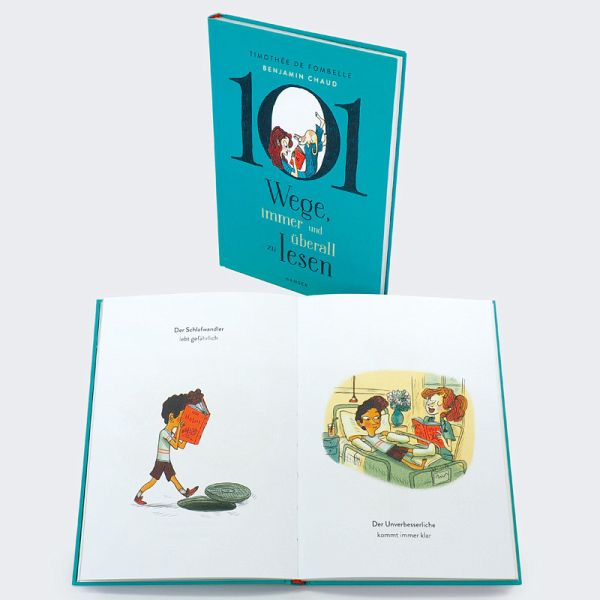 Krake oder Schlafwandler? Welcher Lesetyp sind Sie? Noch nie wurde die Lust am Lesen so gefeiert - DAS Geschenk für BücherfansTimothée de Fombelle beschreibt 101 Möglichkeiten, wie man jederzeit und überall lesen kann! Mit in die Luft gereckten Füßen, zusammengerollt unterm Tisch oder versteckt im Kofferraum: Wahre Bücherfans finden immer einen Weg, zu lesen - um dann in der Welt des Buches zu versinken und alles um sich herum zu vergessen. Illustrator Benjamin Chaud erweckt diese Situationen mit Genuss und Leichtigkeit zum Leben. Eine wahre Feier des Lesens! Wer bereits zur Spezies der Lesenden gehört, wird sich auf jeder Seite wiedererkennen. Und für alle anderen wird die Hingabe und Begeisterung, die in jeder Szene erkennbar ist, eine Einladung sein, selbst in die Welt der Bücher einzutauchen.