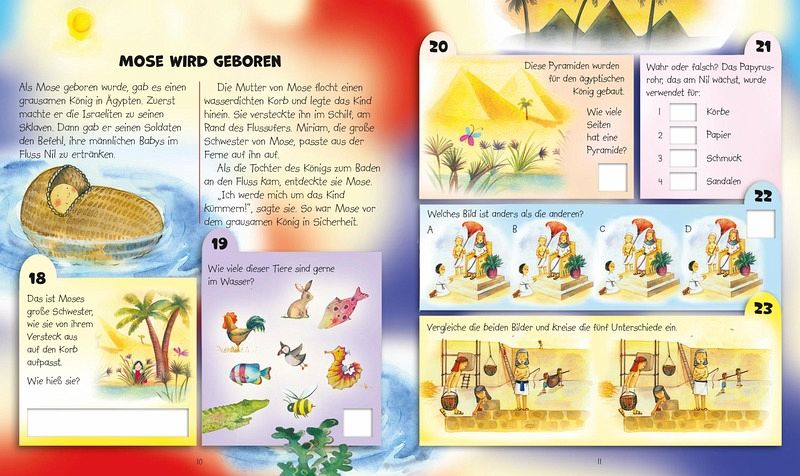 101 x Bibelspaß bietet große Spiel- und Entdeckerfreude für Kinder. Ob Wortsuche, Zählaufgabe, Rätsel oder das Finden und Verbinden von Gegenständen und Begriffen - für alle Spürnasen ist etwas dabei.