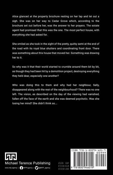 Alice glanced at the property brochure resting on her lap and let out a sigh. She was on her way to Cedar Grove which, according to the brochure set out before her, was the answer to her prayers. The estate agent had promised that this was the one. The most perfect house, with everything she had asked for. She smiled as she took in the sight of the pretty, quirky semi at the end of the road with its royal blue shutters and coordinating front door. There was something about this house that moved her. Something was drawing her to it. So why was it that their world started to crumble around them bit by bit, as though they had been hit by a demolition project, destroying everything they held dear, especially one another? Who was doing this to them and why had her neighbour, Sally, disappeared along with the rest of the neighbourhood? There was no one left. The vision, as described on the day of the viewing had vanished, fallen off the face of the earth and she was deemed psychotic. Was she losing her mind? She didn't think so...