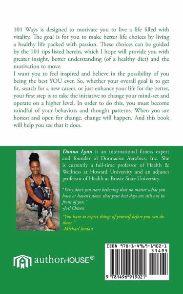 101 Ways is designed to motivate you to live a life filled with vitality. The goal is for you to make better life choices by living a healthy life packed with passion. These choices can be guided by the 101 tips listed herein, which I hope will provide you with greater insight, better understanding (of a healthy diet) and the motivation to move. I want you to feel inspired and believe in the possibility of you being the best YOU ever. So, whether your overall goal is to get fit, search for a new career, or just enhance your life for the better, your first step is to take the initiative to change your mind-set and operate on a higher level. In order to do this, you must become mindful of your behaviors and thought patterns. When you are honest and open for change, change will happen. And this book will help you see that it does.