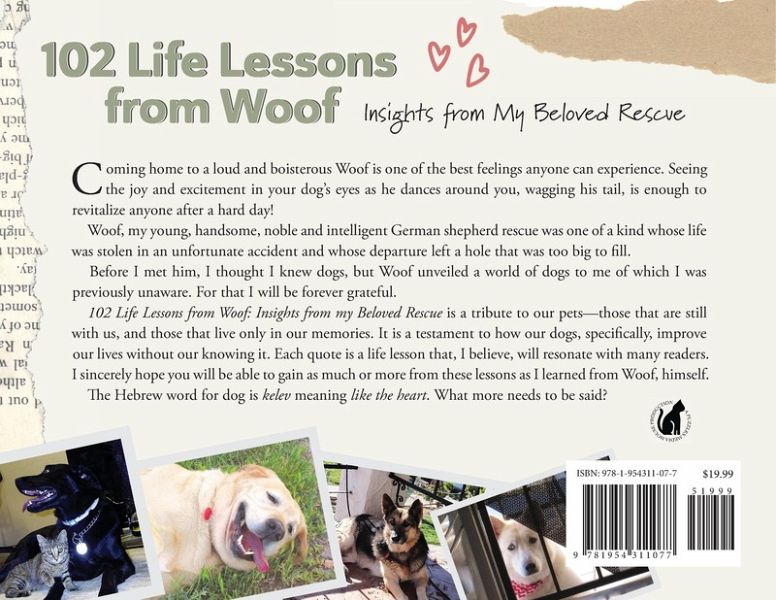 Coming home to a loud and boisterous Woof is one of the best feelings anyone can experience. Seeing the joy and excitement in your dog's eyes as he dances around you, wagging his tail, is enough to revitalize anyone after a hard day! Woof, my young, handsome, noble and intelligent German shepherd rescue was one of a kind whose life was stolen in an unfortunate accident and whose departure left a hole that was too big to fill. Before I met him, I thought I knew dogs, but Woof unveiled a world of dogs to me of which I was previously unaware. For that I will be forever grateful. This book, is a tribute to our pets-those that are still with us, and those that live only in our memories. It is a testament to how our dogs, specifically, improve our lives without our knowing it. Each quote is a life lesson that, I believe, will resonate with many readers. I sincerely hope you will be able to gain as much or more from them as I learned from Woof, himself. The Hebrew word for dog is kelev meaning like the heart. What more needs to be said?