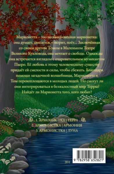 Марионетта - это необыкновенная марионетка она думает, двигается, говорит, поёт... Заключённая со своим другом Томом в Маленьком Театре Великого Кукловода, она мечтает о свободе. Однажды она встречается взглядом с очаровательным музыкантом Пьеро. Её любовь к этому человеческому существу придаёт ей смелости и силы, чтобы сбежать. Благодаря помощи загадочной волшебницы, Марионетта и Том перевоплощаются в молодых людей. Но смогут ли они интегрироваться в безжалостный мир Терры? Найдёт ли Марионетта того, кого любит? Откройте для себя Первый Том Трилогии Армонистка, переведённый на русский язык. Роман написан певицей, баянисткой и YouTube-блогером Марион Ламолинери (она же LMJM). Её канал YouTube LMJM ОФИЦИАЛЬНЫЙ насчитывает тысячи подписчиков и миллионы просмотров. Не поленитесь заглянуть! Сегодня она приглашает Вас окунуться в романтическую, фантастическую атмосферу с Армонисткой Терра, чтобы Вы могли узнать больше об удивительной истории Марионетты. Роман насчитывает 260 страниц. С 10 лет. Жанр Фэнтези, Молодёжный