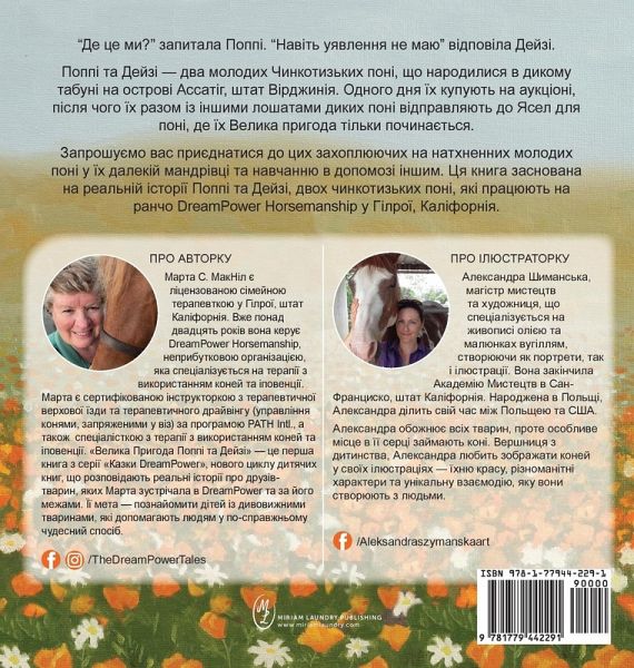 "Де це ми?" запитала Поппі. "Навіть уявлення не маю" відповіла Дейзі. Поппі та Дейзі - два молодих Чинкотизьких поні, що народилися в дикому табуні на острові Ассатіг, штат Вірджинія. Одного дня їх купують на аукціоні, після чого їх разом із іншими лошатами диких поні відправляють до Ясел для поні, де їх Велика пригода тільки починається. Запрошуємо вас приєднатися до цих захоплюючих на натхненних молодих поні у їх далекій мандрівці та навчанню в допомозі іншим. Ця книга заснована на реальній історії Поппі та Дейзі, двох чинкотизьких поні, які працюють на ранчо DreamPower Horsemanship у Гілрої, Каліфорнія.